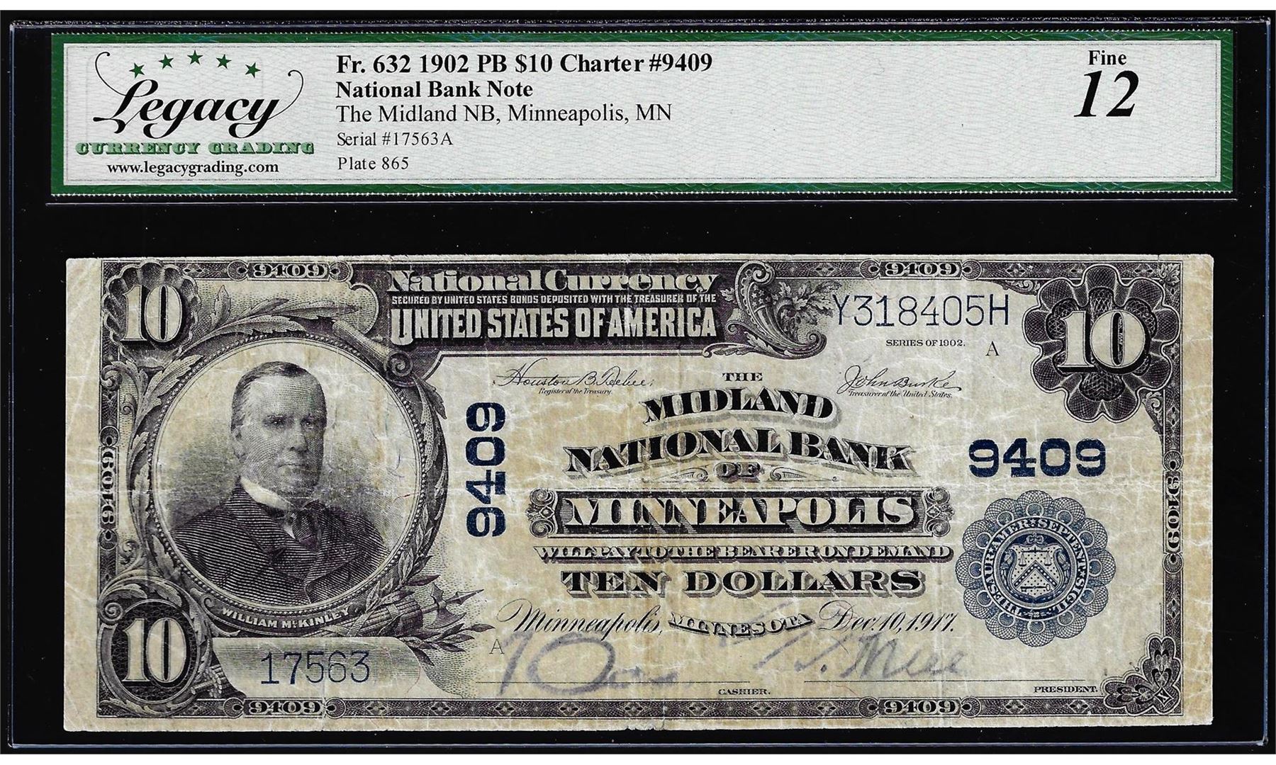 One 1902 $10 Midland NB of Minneapolis, MN CH# 9409 Fr.632 National Currency Note Fine 12. Legacy Graded.