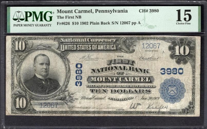 One 1902 $10 Mount Carmel PA National PMG 15.