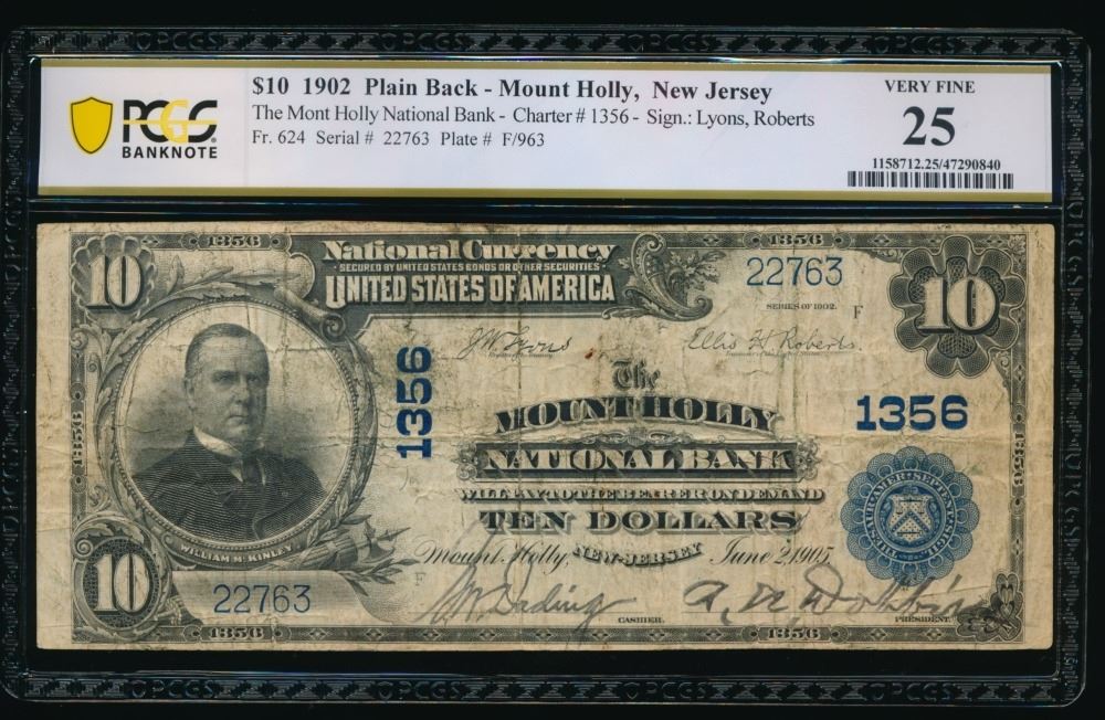 One 1902 $10 Mount Holly NJ National PCGS 25.
