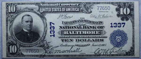 1902, $10 National Bank Note, Plain Back, Baltimore. Md, The Farmers and Merchants National Bank