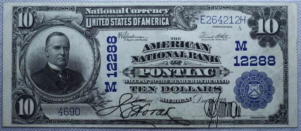 1902, $10 National Bank Note, Plain Back, Pontiac, Mi, The American National Bank