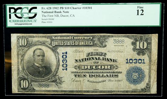 1902, $10 National Bank Note. The First NB, Ducor, CA. Ch. # 10301. PCGS Fine 12. . Fr-628. One of just six known large size notes from this scarce Tulare County bank. When this example last sold as part of the fabulous Lowell Horwedel collection in 2004, it brought $2,300. Expect a similar result today.