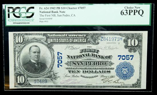 1902, $10 National Bank Note. The First NB, San Pedro, CA. Ch. # 7057. PCGS Choice New 63PPQ. . Fr-624. Less than a dozen large size notes are known from this bank, and this piece is as nice as any of them. It is strictly original, boldly embossed, and is limited only by a sheet fold in the top margin. The pen signatures are in two colors, and the eye appeal is superb. A similar high grade note brought $4,600 in the Horwedel sale nearly seven years ago; expect perhaps a bit more today.