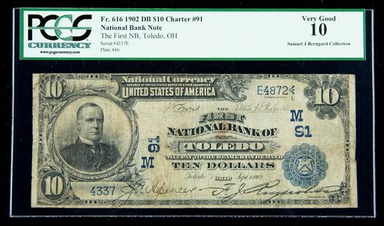 1902, $10 National Bank Note. The First NB, Toledo, OH. PCGS Very Good 10. . Fr-616. No mentionable problems for the grade.