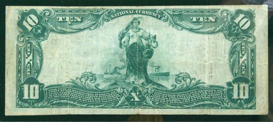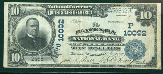 1902, $10 National Bank Note. The Placentia NB, Placentia, CA. PCGS Very Fine 25. . Fr-628. This large size-only bank was the only bank in town. It was chartered in 1911 and liquidated in 1926. This note is a lovely crisp example, with sharp pen signatures of John E. Scott as cashier and A.S. Bradford as bank president. It is pedigreed to the Colver collection and realized $2,500 in 1998; it last sold for more than $5,000 when it last appeared as part of Lowell Horwedel's collection in 2004.