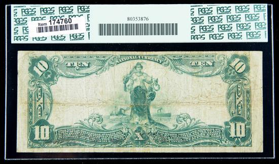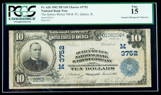 1902, $10 National Bank Note. The Quicy-Ricker NB & TC, Quincy, IL. PCGS Fine 15. . Fr-626. From this bank's second title, one of about three dozen large size notes now reported from this institution.