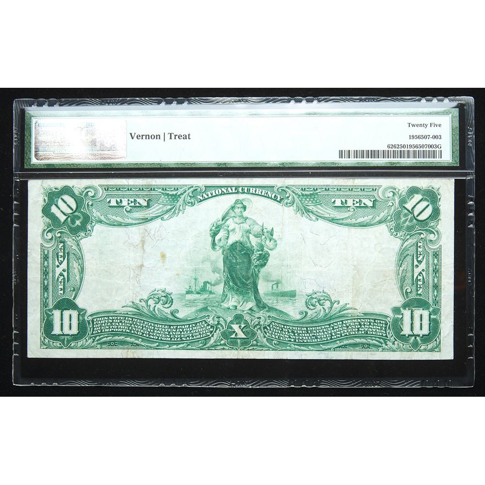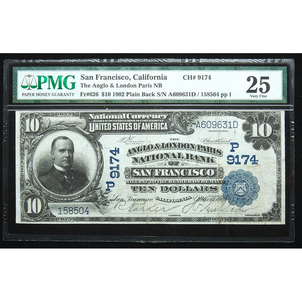 1902, 10 National Bank Note. The Anglo & London Paris NB of San Francisco, CA. Fr-626. KL-1230. Plain Back. Charter 9174. S/N A609631D. PMG Very Fine 25. Nice and bright. Estimated Value 125 - 150