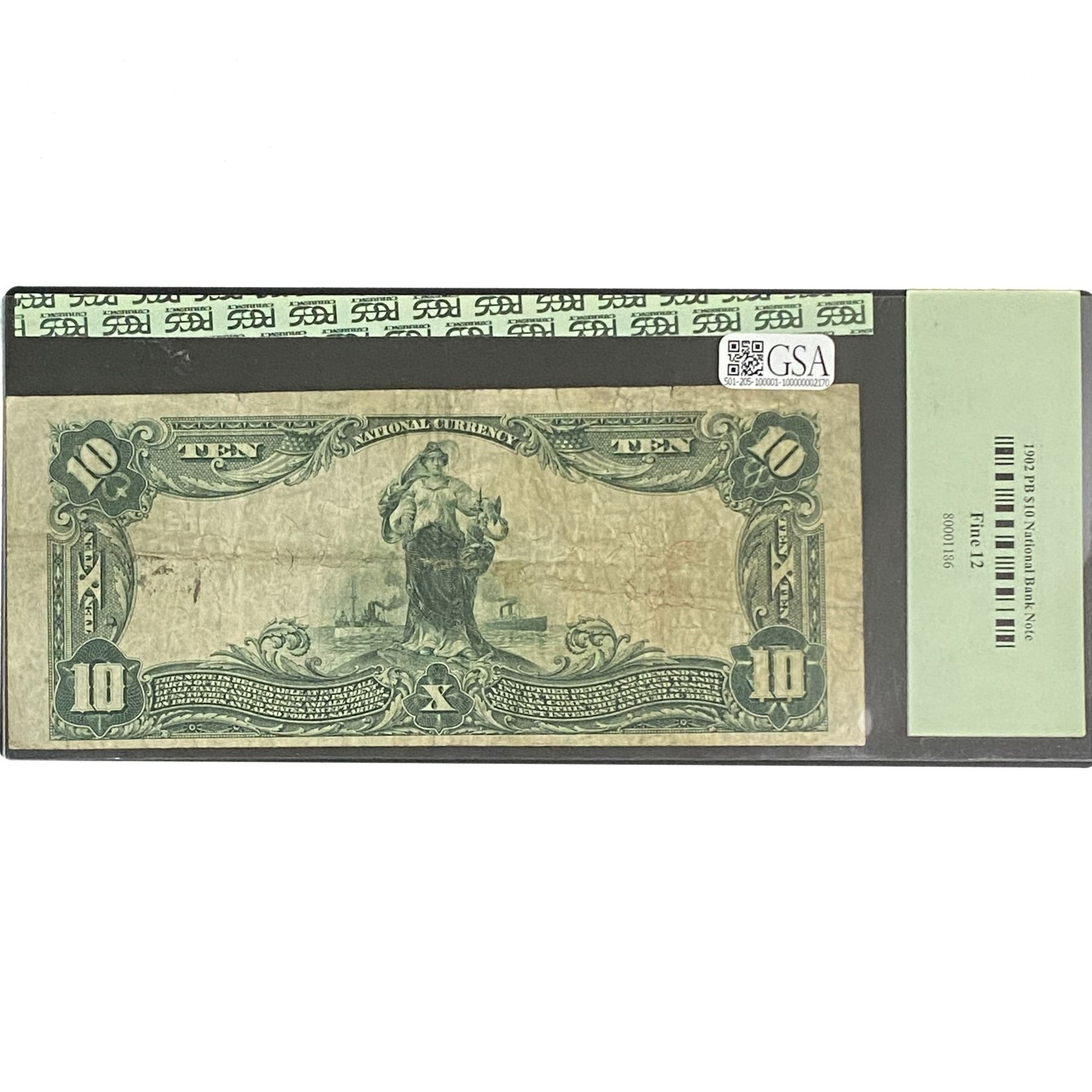 f. Notes sold referencing a third-party grading service are sold “AS IS” without any express or implied warranty, except for guarantee by GSA that they are genuine. Grading, condition or other attributes of any Product may have a material effect on its value and the opinion of others, including third-party grading services such as PCGS Currency and PMG may differ with that of GSA. GSA shall not be bound by any prior or subsequent opinion, determination, or certification by any grading service. Bidders specifically waive any claim to right of return of any Product because of the opinion, determination, or certification, or lack thereof, by any grading service. Certain warranties may be available from the grading services and Bidders are referred to them for further details: Paper Money Guaranty (PMG), PO Box 4711, Sarasota, FL 34230; PCGS Currency, PO Box 10470, Peoria, IL 61612-0470; PCGS Gold Shield, PO Box 9458, Newport Beach, CA 92658. Third-party graded notes are not returnable for any reason whatsoever.