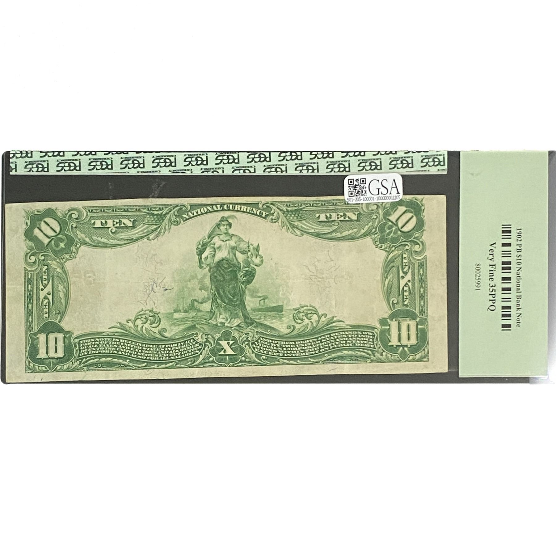 f. Notes sold referencing a third-party grading service are sold “AS IS” without any express or implied warranty, except for guarantee by GSA that they are genuine. Grading, condition or other attributes of any Product may have a material effect on its value and the opinion of others, including third-party grading services such as PCGS Currency and PMG may differ with that of GSA. GSA shall not be bound by any prior or subsequent opinion, determination, or certification by any grading service. Bidders specifically waive any claim to right of return of any Product because of the opinion, determination, or certification, or lack thereof, by any grading service. Certain warranties may be available from the grading services and Bidders are referred to them for further details: Paper Money Guaranty (PMG), PO Box 4711, Sarasota, FL 34230; PCGS Currency, PO Box 10470, Peoria, IL 61612-0470; PCGS Gold Shield, PO Box 9458, Newport Beach, CA 92658. Third-party graded notes are not returnable for any reason whatsoever.