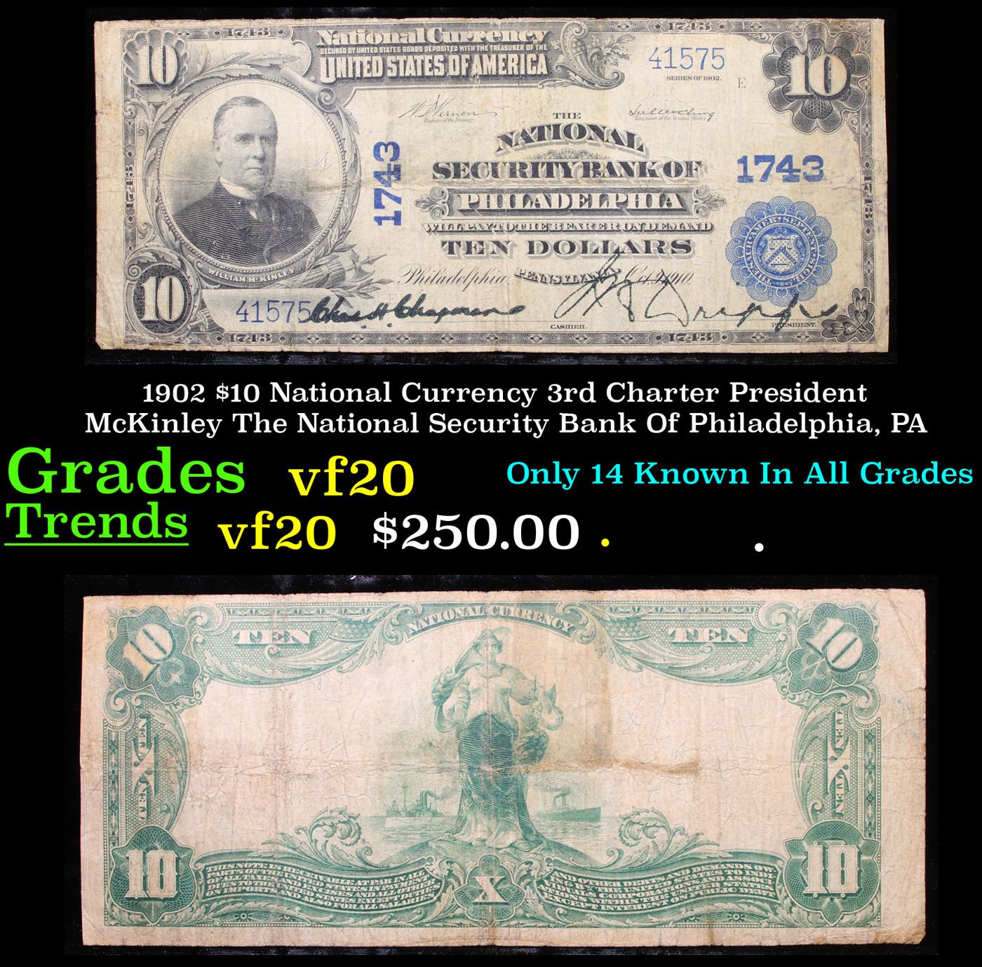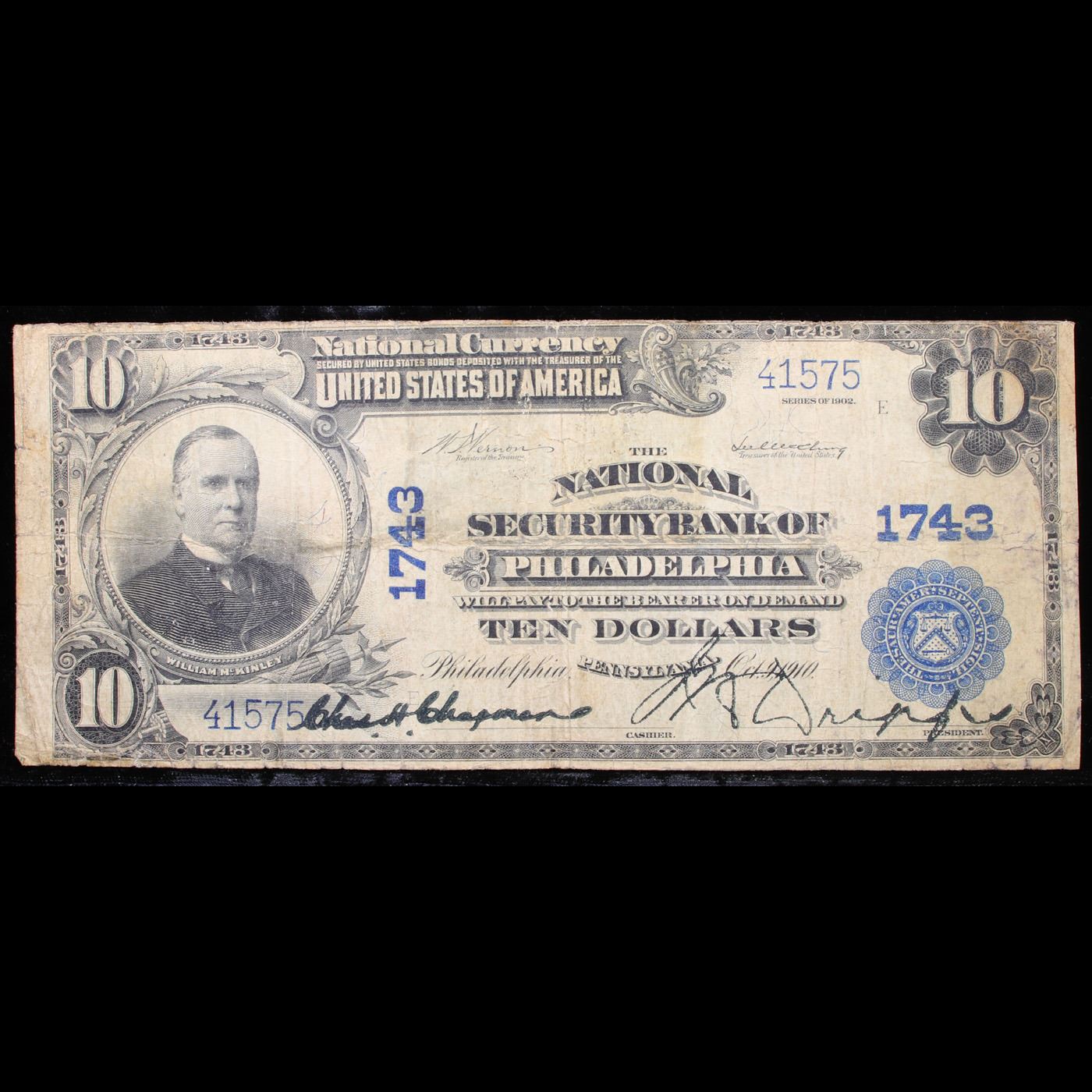 1902 $10 National Currency 3rd Charter President McKinley The National Security Bank Of Philadelphia, PA Grades vf, very fine. This note belongs to an important series of United States currency in that it is the last type note of National Bank Currency printed in the old larger size. At the beginning of the final charter of notes (1929) all the new notes are made in the new smaller size. This note also features the portrait of William McKinley 25th president of the United States, who had been shot and killed at the Pan-American Exposition just a few months before the first notes in this series were printed and released bearing his image. National bank notes are different from other nationally printed currency in that they are printed specifically for each individual chartered bank organization. This assisted greatly in creating a system of bank notes that were the same across the country. This aided in travelers knowing what they were spending and receiving in change, rather than the times when each bank and state printed their own currency with their own designs. The National Bank Note system was abandoned shortly after the changeover to smaller size notes in 1929, making the third charter notes the last truly used issue of this kind.
