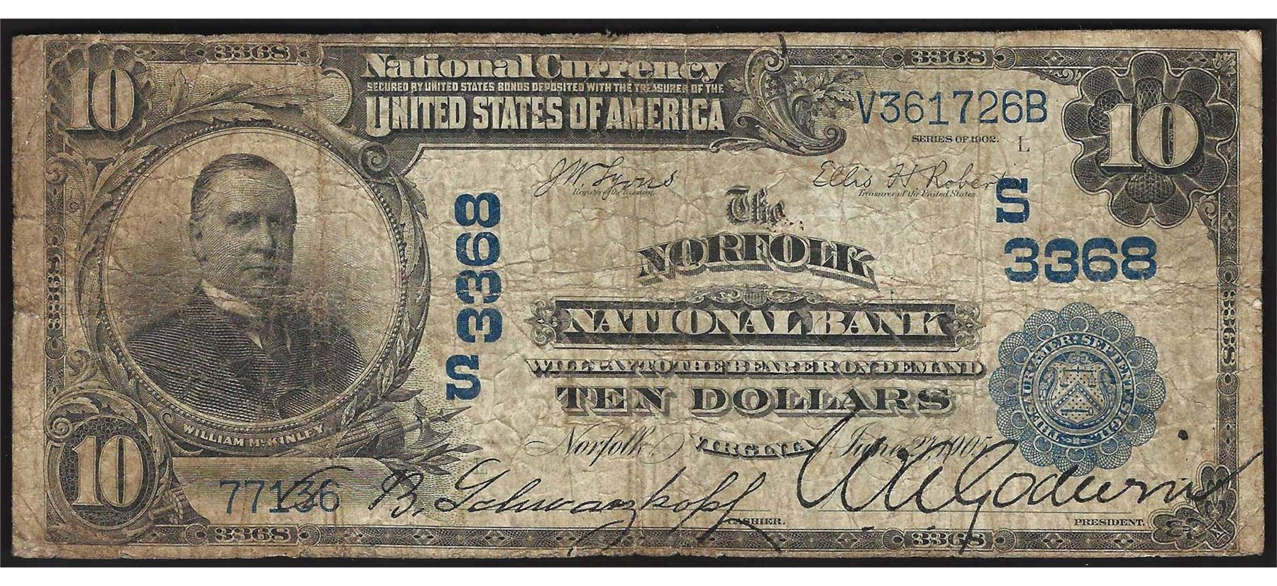 One 1902 $10 Norfolk National Bank Currency Note CH# 3368.
