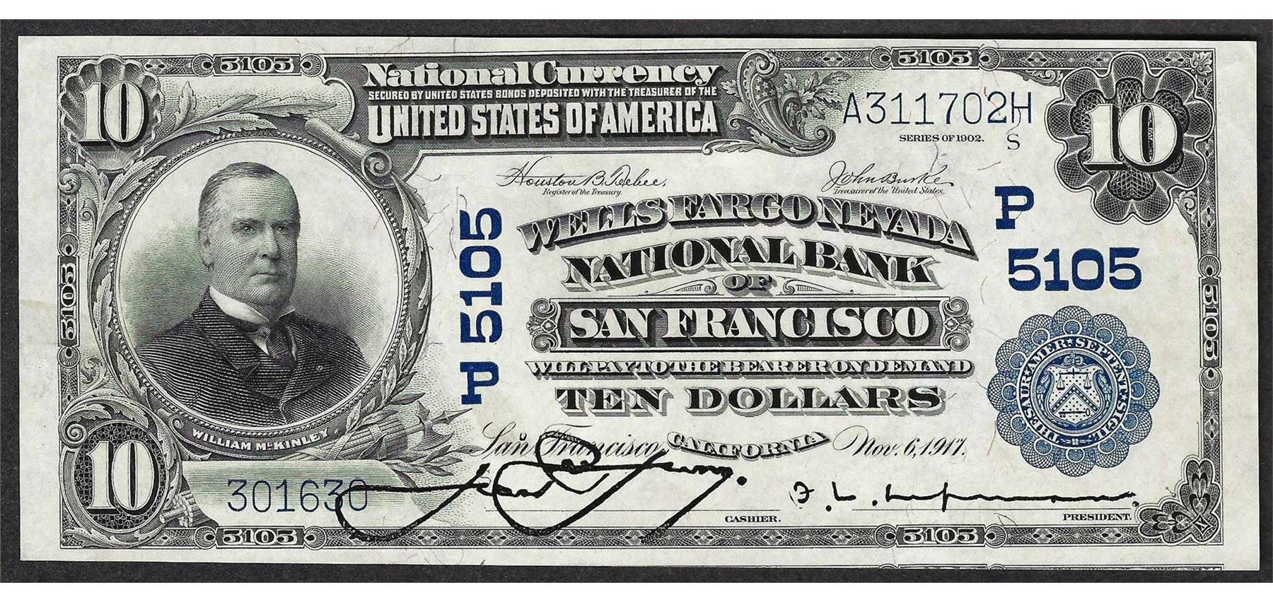 One 1902 $10 PB San Francisco, CA National Currency Note CH# 5105.