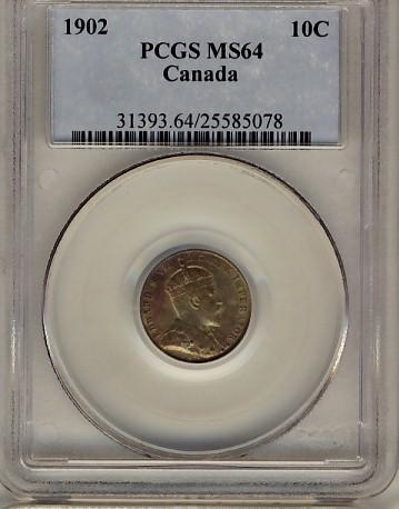 1902 10¢ PCGS MS64. Super gold and pink tones.