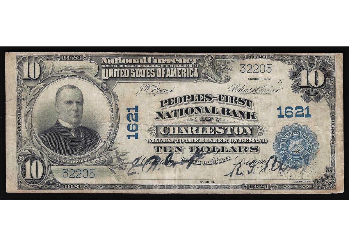 One 1902 $10 Peoples-First National Bank of Charleston Currency Note.