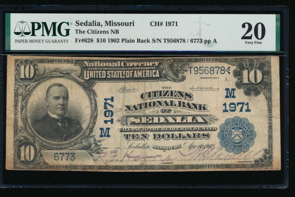 One 1902 $10 Sedalia National Bank Note PMG 20.
