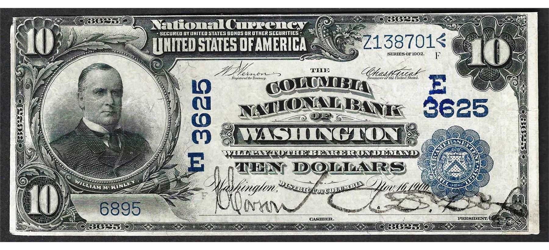 One 1902 $10 The Columbia National Bank of Washington Note CH#3625.