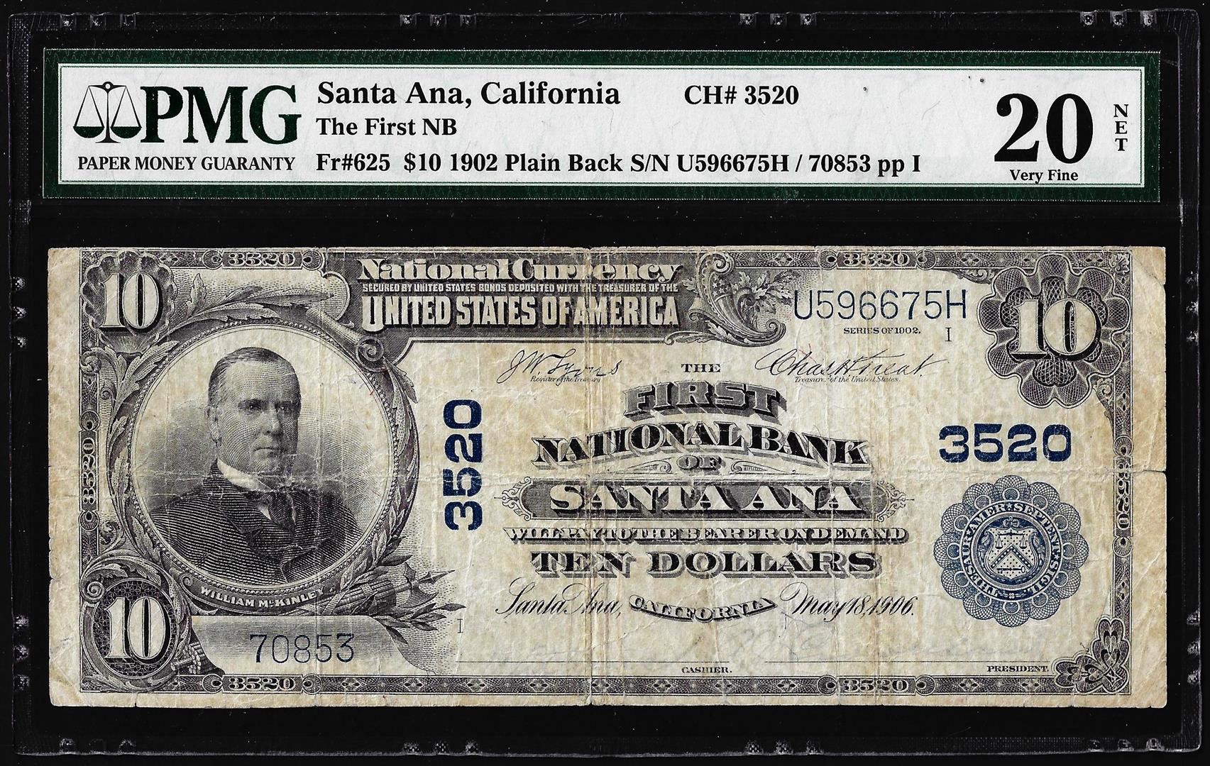 1902 $10 The First NB of Santa Ana, CA National Note CH# 3520 PMG Very Fine 20 Net
