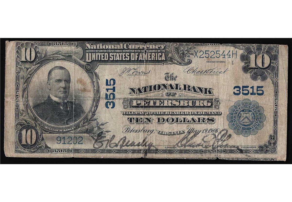 One 1902 $10 The National Bank of Petersburg Currency Note.