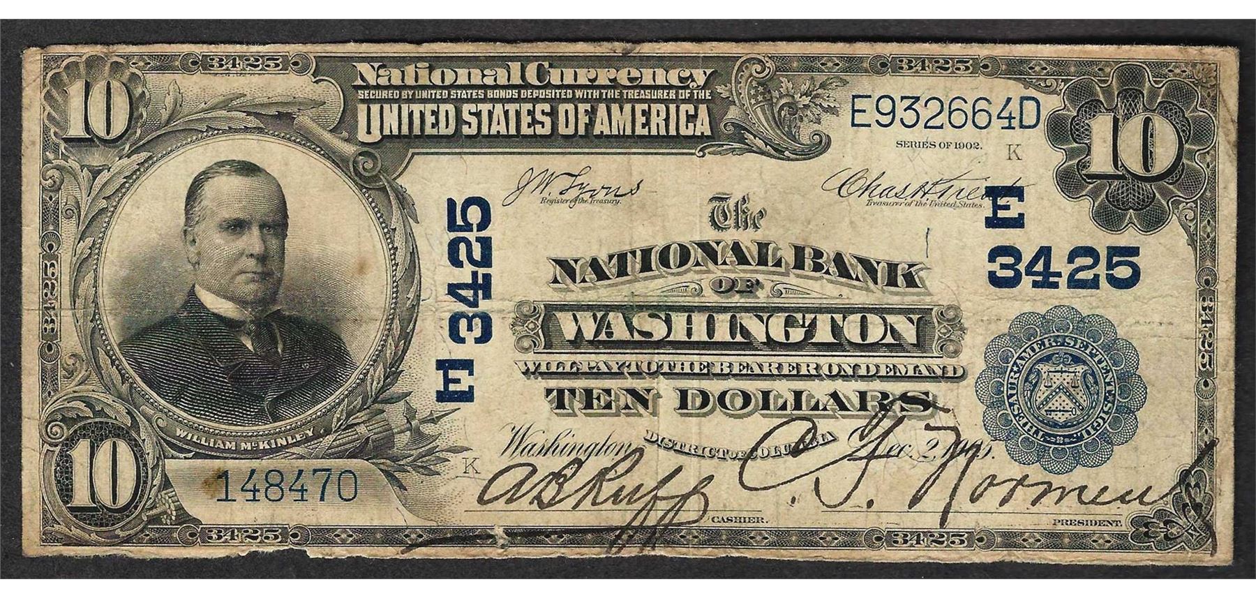 One 1902 $10 The National Bank of Washington Note CH# 3425.