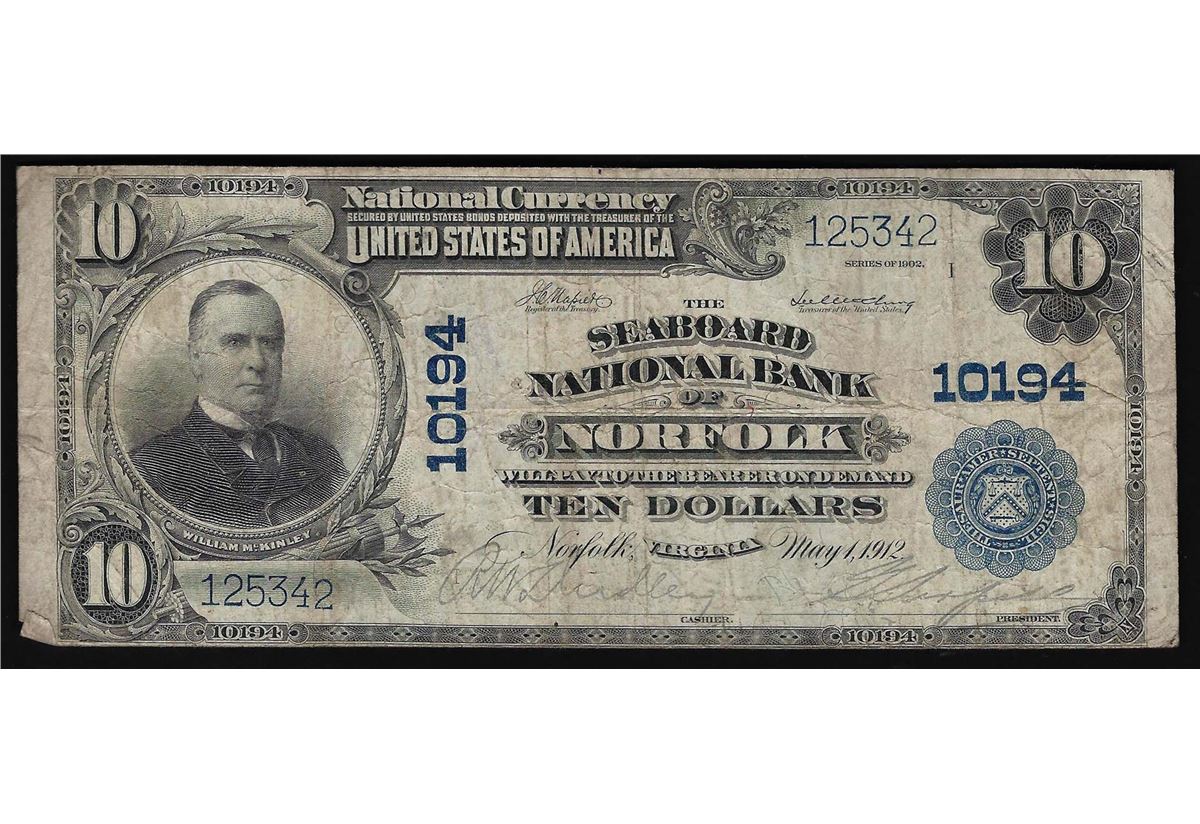 One 1902 $10 The Seaboard National Bank of Norfolk Virginia National Currency Note.