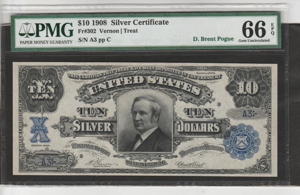 One 1902 $10 Tombstone Silver Certificate PMG 66EPQ.