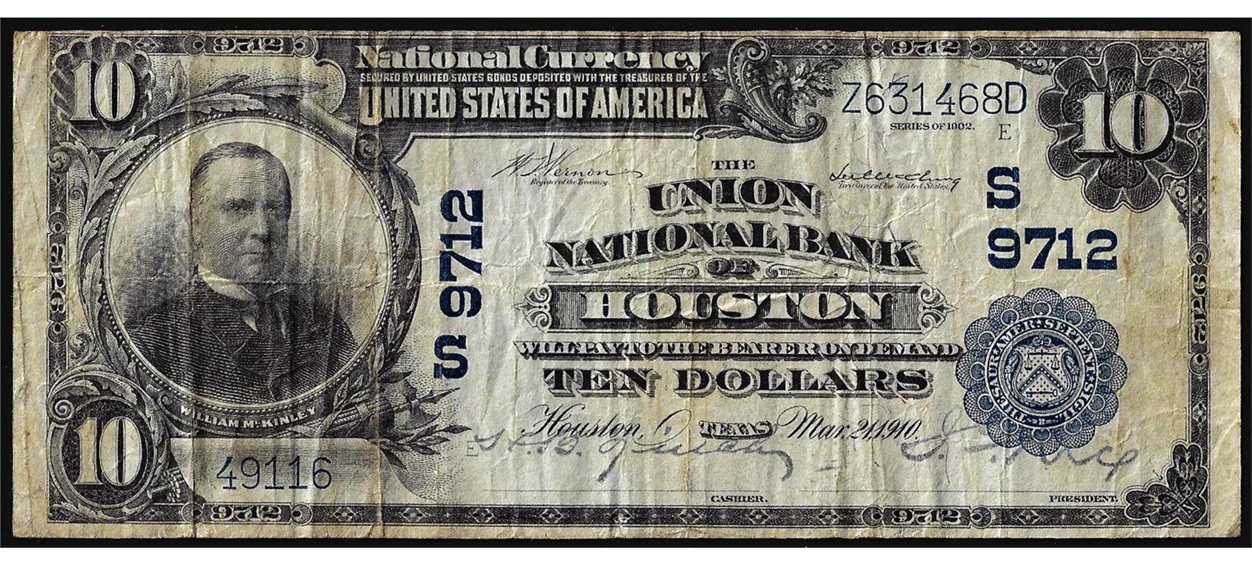 One 1902 $10 Union NB of Houston, TX CH# 9712 National Currency Note.