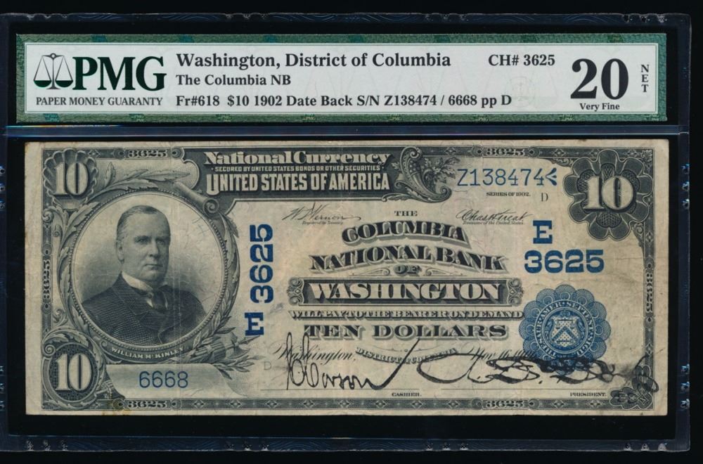 One 1902 $10 Washington DC National Bank Note PMG 20NET.