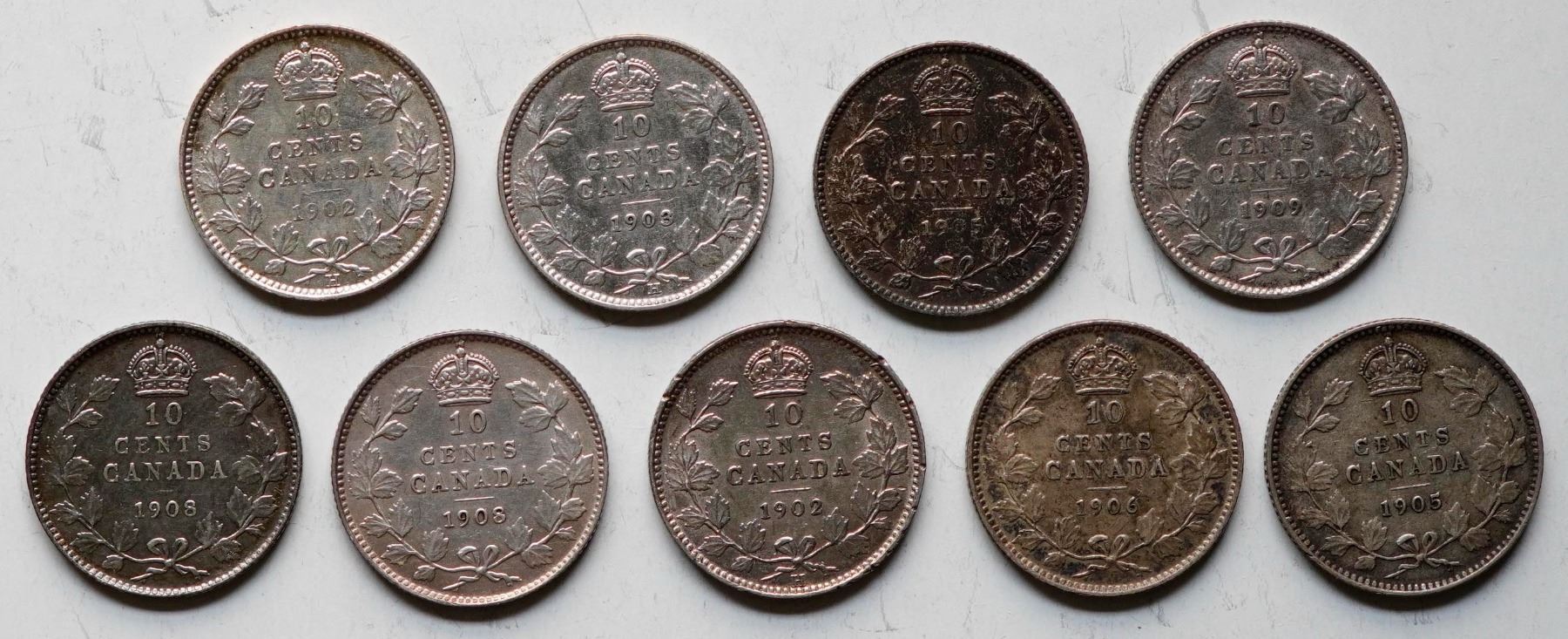 1902 10¢ to 1909. Alot of 9 Edward VII pcs EF and better on average w/some exceptions.