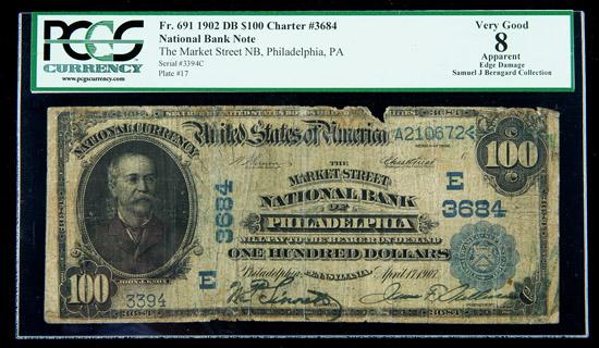 1902, $100 National Bank Note. The Market Street NB, Philadelphia, PA. PCGS Apparent Very Good 8. . Fr-691. Only four $100 Plain Backs are known from this neighborhood bank. PCGS Currency has mentioned some edge damage that is present.