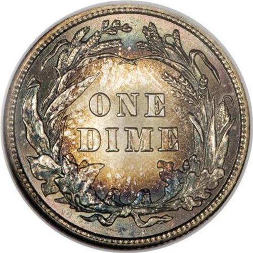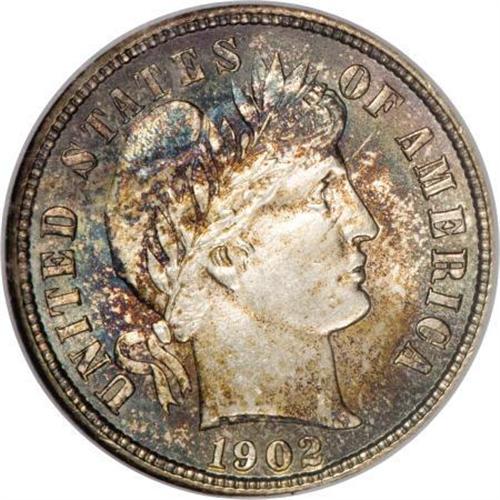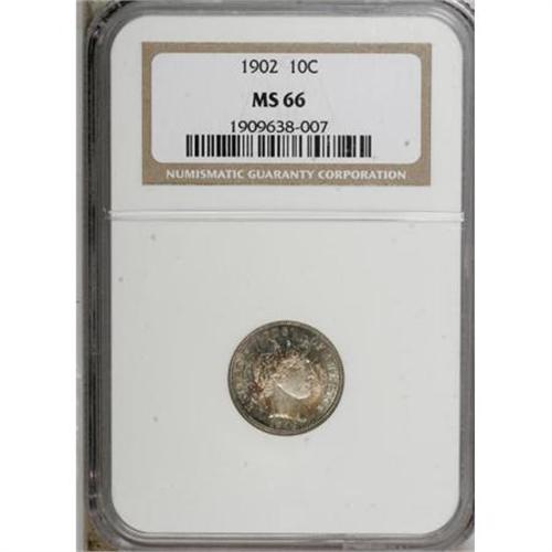 <B>1902 10C MS66 NGC.</B></I> Autumn-gold, rose, and sea-green embrace this satiny Premium Gem, although the centers are untoned. A sharply struck and unblemished high grade example. Census: 10 in 66, 0 finer (12/07).<BR><BR><B>Coin Engraver:</B> Charles E. Barber<BR><BR><b>Shipping:</b> Coins & Currency (<a target="_blank" href="http://www.heritageauctions.com/common/shipping.php">view shipping information</a>)
