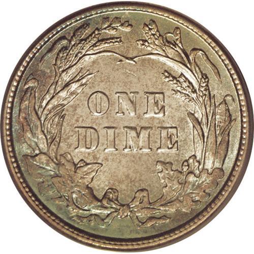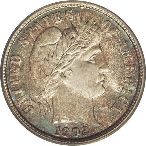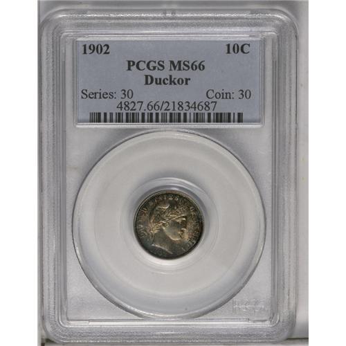 <B>1902<10C> MS66 PCGS.</B></I> Ex: Duckor. A thoroughly delightful coin with sharp design features and frosty luster. The obverse has pale blue and rose tints over medium golden toning. The reverse is mostly brilliant with peripheral blue-green. Pristine save for a tick above the N in ONE. An exceptional example for the Barber Dime enthusiast who demands the finest available quality. Population:13 in 66, 1 finer (6/06).