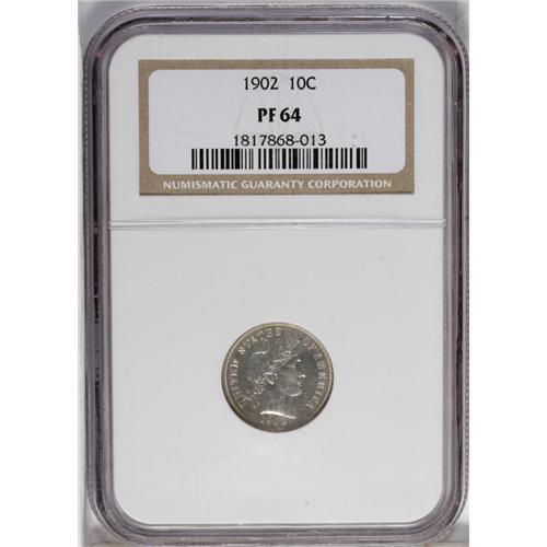 <B>1902<10C> PR64 NGC.</B></I> Moderate contrast is noted on each side, although not deep enough for a Cameo designation. Light silver-gold patina overall, but with a few straight-line scrapes on the cheek and neck that limit the grade.