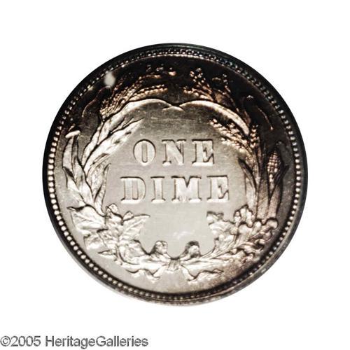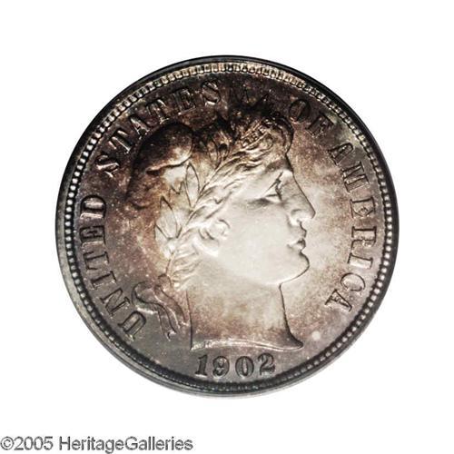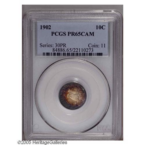 <B>1902<10C> PR65 Cameo PCGS.</B></I> One of just 777 pieces struck, this Gem Proof exhibits strong field to motif contrast. The centers are untoned or lightly so, with the borders being richly endowed with deep magenta, cobalt-blue, and russet coloration. Excellent definition is apparent on the design elements, and the surfaces are devoid of mentionable contact marks. Die striations are visible over each side. The only Gem Proof Cameo certified by PCGS, with none finer (11/05).
