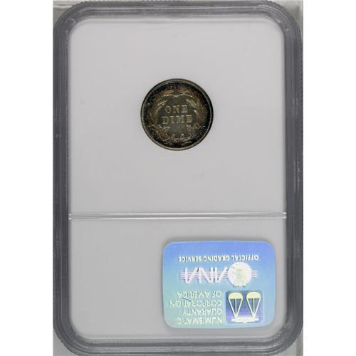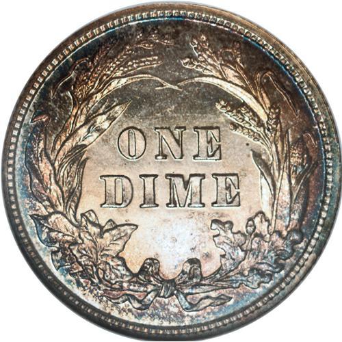 <B>1902<10C> PR67 NGC.</B></I> This magnificent proof Barber dime pops with highly reflective luster over all of its surfaces. The well struck and lightly frosted devices add to this coin's attraction. White centers roll to magenta to electric-blue on both sides, but moreso on the obverse. Major eye appeal. Census: 11 in 67, 1 finer (2/06).