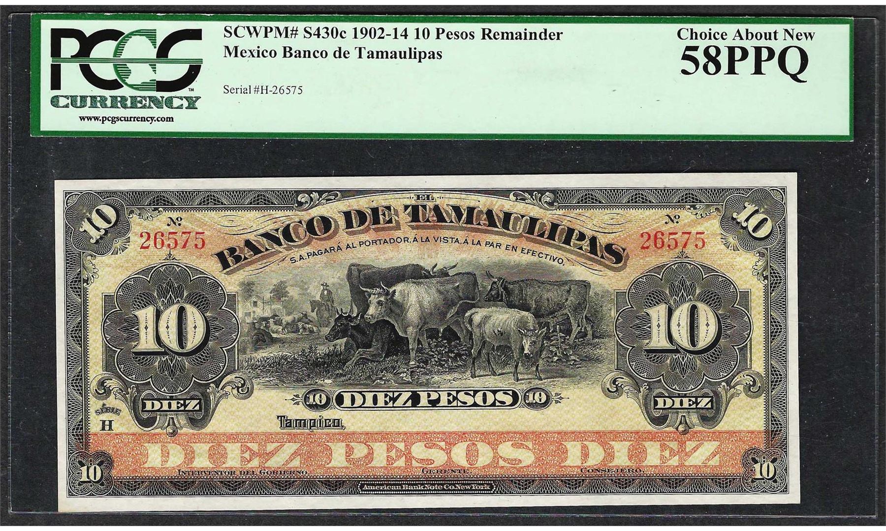One 1902-14 Mexico 10 Pesos Banco of Tamaulipas Note PCGS Choice About New 58PPQ. PCGS Graded.