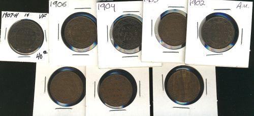 1902, 1903, 1904, 1906, 1907H, 1908, 1909, 1910. Lot of 8 pieces, grades vary from EF-40 to AU-50. Nice!