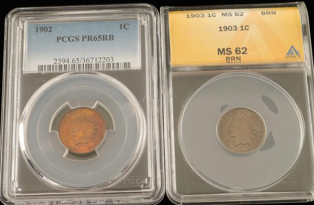 1902-PCGS PR65RB in PCGS case and 1903 MS 62 BRN in ANACS case.