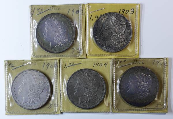 1902-1904 Morgan Dollars, 5 pieces