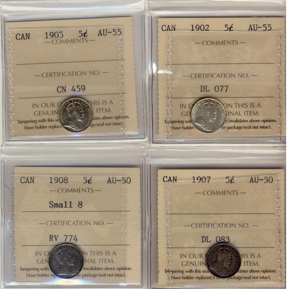 1902, 1905 5¢ AU55 & 1907, 1908 Sml 8 5¢ AU50. Lot of 4 ICCS coins.