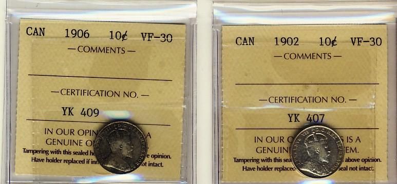 1902 & 1906 10¢ ICCS VF30. Lot of 2 coins.