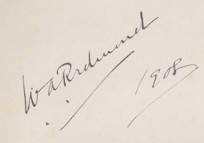 The speeches include: Ireland and the Coronation Why Ireland is Discontented. 9 August, 1902. 8pp; (2) The Failure of British Government in Ireland, 4 February, 1904. 15pp.; (3) Ireland's Financial Relations with England. The Case Stated., 26 January, 1905 12pp.; (4) The Irish Problem, 19th January, 1906. 12pp; (5) Irish Government, 12 February, 1907. 20pp.; (5) Some Arguments for Home Rule: Being a Series of Speeches delivered in the Autumn of 1907, preface and notes by J.G. Swift MacNeill. (January, 1908). 100pp. SIGNED AND DATED W.A. REDMOND 1908 on fly leaf. William Archer Redmond was the son of John Redmond and he too served as an Irish Parliamentary Party MP.