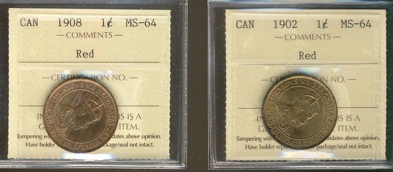 1902 & 1908 1¢ ICCS MS64RD. Lot of 2 coins.