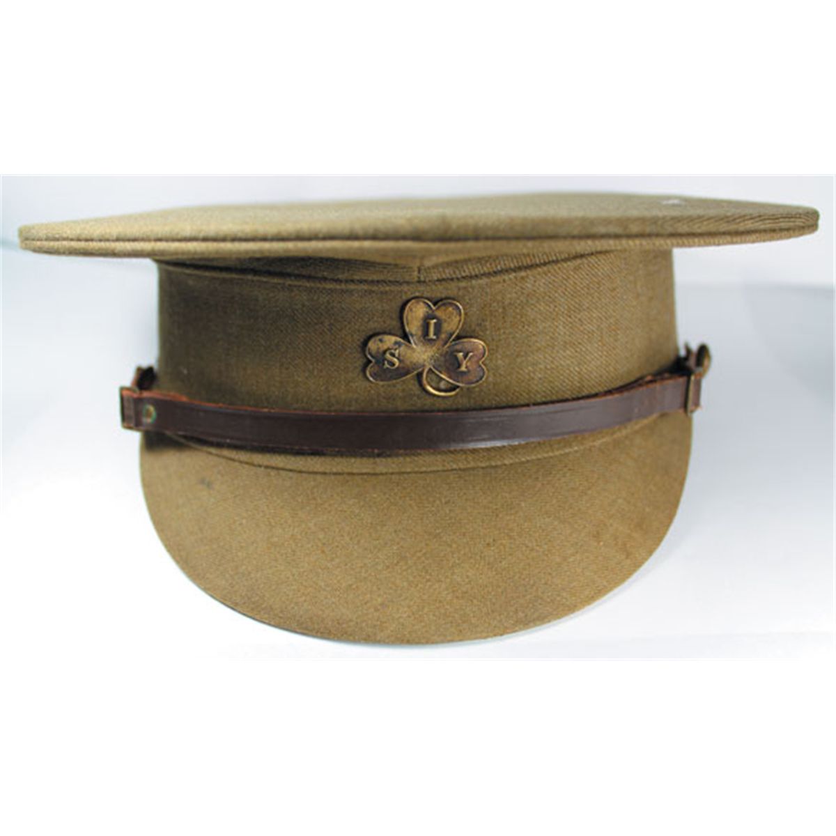 British service dress cap made by McClymont and Dewar, Glasgow with scarce S.I.Y. cap badge to front, gilt with two lugs. Leather chin strap affixed by two general service buttons. The South of Ireland Imperial Yeomanry was a cavalry unit of the British Army existing between 1902 and 1908 when it was renamed the South Irish Horse.