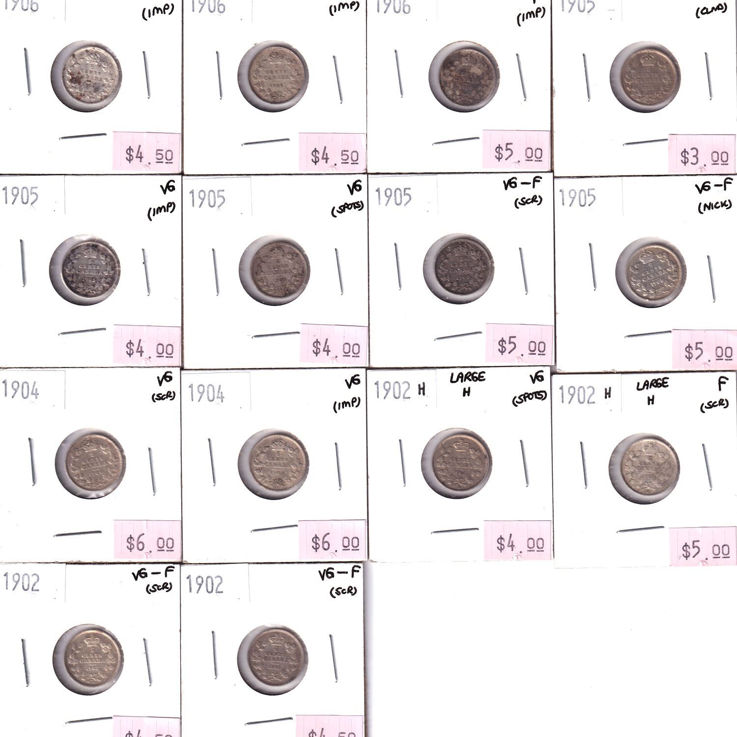 1902-1910 Canada Edward VII 10-cent G-VG to Fine - 4x 1902, 2x 1904, 5x 1905, 3x 1906, 4x 1907 & 7x 1910. Coins contain various impairments. 25pcs