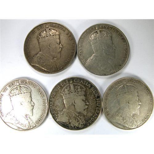 Canada Fifty Cents 1902, 1907, 1910 Victorian Leaves and 1910 Edwardian Leaves two pieces. Total five pale toned to light-medium toned pieces, all Fine