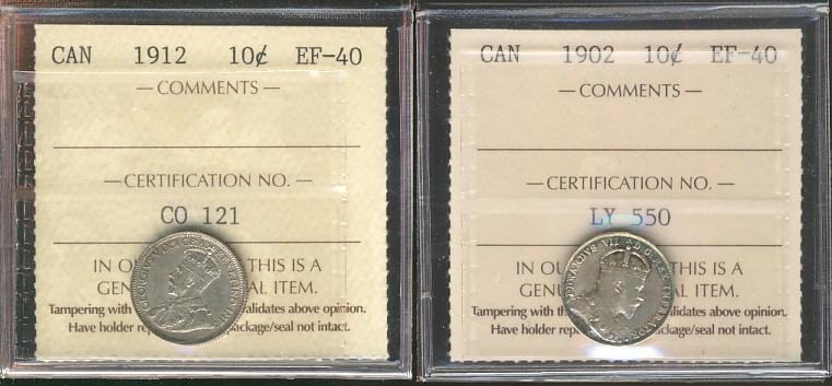 1902 & 1912 10¢ ICCS EF40. Lot of 2 coins.