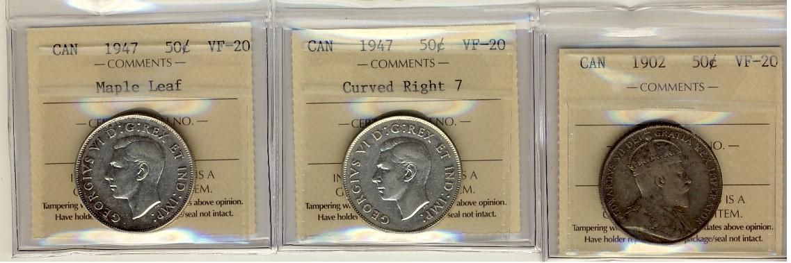 1902, 1947 C7R & 1947 ML 50¢ ICCS VF20. Lot of 3 coins.