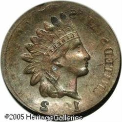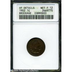 <B>1902 1C Indian Cent--Brockage, Corroded--ANACS. VF Details, Net Fine 12.</B></I> The reverse exhibits an early state brockage of the obverse design, reversed and incused but without the distortion found on later state brockages. The brockaged portrait is sharp, with the profile and every letter in LIBERTY crisp. The peripheral legends are softer in definition, although UNITED is mostly bold, as is the 1 and 2 in the date. Mauve color dominates the circulated and faintly granular obverse, the reverse features bright gold and lime-green colors. Lot:10831