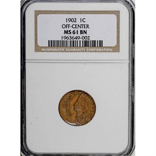 <B>1902 1C Indian Cent--Off Center--MS61 NGC.</B></I> Struck approximately 20% off center toward 2 o'clock. A chocolate-brown mint error with hints of steel-blue on the device highpoints. The fields are unabraded, while the jaw and neck each display a thin, faint mark.<BR><BR><B>Coin Engraver:</B> James B. Longacre<BR><BR><b>Shipping:</b> Coins & Currency (<a target="_blank" href="http://www.heritageauctions.com/common/shipping.php">view shipping information</a>)