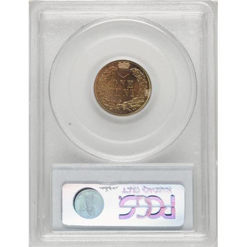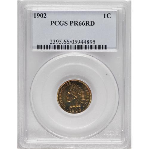 <B>1902 1C PR66 Red PCGS.</B></I> Bright copper-gold coloration is joined by ruby-red on the reverse. Exquisitely struck throughout, including razor-sharp definition on the feathers ends and diamonds. A fleck or two is noted on each side. Not that many full-red specimens are extant out of a mintage of 2,018 proofs. Population: 24 in 66 Red, 9 finer (3/07).<BR><BR><b>Shipping:</b> Coins & Currency (<a target="_blank" href="http://www.heritageauctions.com/common/shipping.php">view shipping information</a>)